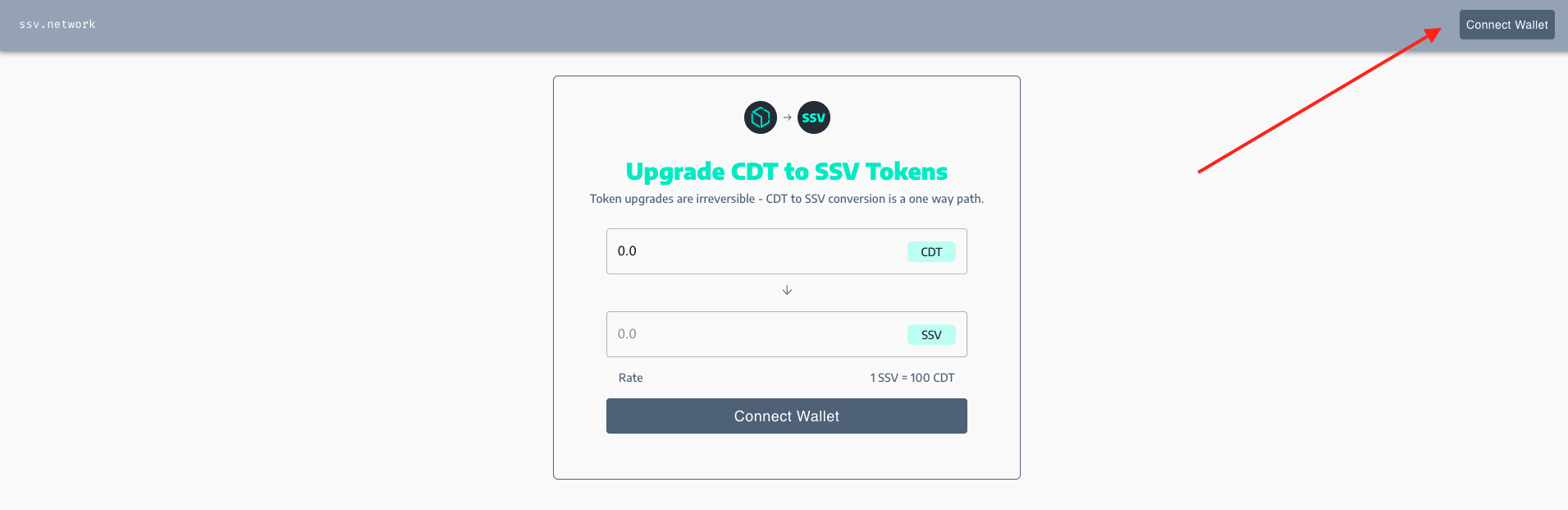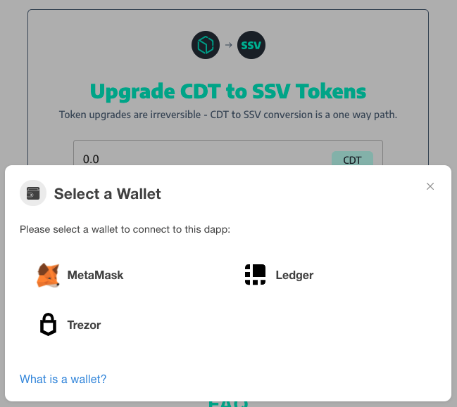 Click on the ‘Connect Wallet’ button in order to associate the relevant ERC20 address to the upgrade page.